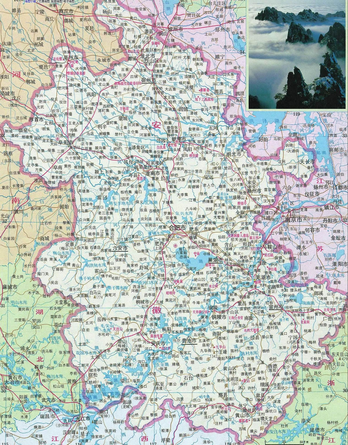 安徽建省始于清康熙初年,取舊時的安慶、徽州兩府的首字而得名。安徽以長江為界,形成了皖北和皖南兩大地域:合肥、宿州、淮北、亳州、阜陽、淮南、蚌埠、滁州、巢湖、安慶、六安11市在皖北;黃山、池州、銅陵、宣城、蕪湖、馬鞍山6市在皖南。