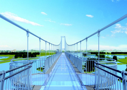 八里河懸空水上觀光玻璃天橋,全長425米,寬3米,全高55米,采用全透明特種玻璃建造,像一條蜿蜒的飛龍盤旋在八里河水面之上。將9D聲光電碎彩屏、花鳥游魚立體特效等流行科技元素與橋面結(jié)合震動(dòng),同時(shí)還有音效。 |