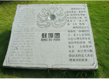 蚌埠園內(nèi)草地上的七顆白色大理石球,象征蚌埠的珍珠,造型根據(jù)七星北斗的形狀所擺放的。右邊墻上的浮雕全部是用純銅制作,講述的是大禹治水的故事。浮雕下面是珍珠泉。浮雕的最右邊有毛澤東題詞:“一定要把淮河修好”。