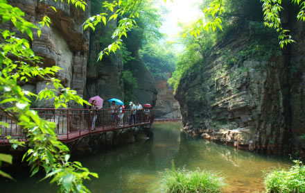 瀑布的上方有一個天然的龍鳳雙池,山澗的泉水經過龍鳳雙池的轉化,再瀉向落差有29米深的谷底,只聽見陣陣轟鳴。在谷底仰望,只見瀑布高掛,水勢凌空而下,似滾珠瀉玉,落向霧氣騰騰的潭內,真是“飛流直下三千尺,疑是銀河落九天”。