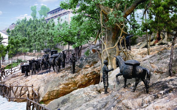 五千年文博園復(fù)原茶馬古道滇藏路線一段,設(shè)麗江客棧、香格里拉客棧,長500米。古道依山體而建,以人物雕塑、實(shí)景微縮的形式,打造出馬幫、背夫、牦牛在崇山峻嶺間穿梭,翻山越嶺、長途跋涉的意境。形象逼真、栩栩如生,再現(xiàn)了辛勤的馬幫日復(fù)一日、年復(fù)一年,用生與死開辟出一條通往域外的經(jīng)貿(mào)之路,一條人文精神的超越之路,也因此歌頌?zāi)切椴貪h民族的團(tuán)結(jié)和興旺作出貢獻(xiàn)的人們。