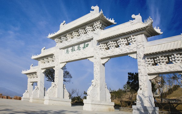 牌坊,一種中國特有的門洞式建筑,《現(xiàn)代漢語詞典》解釋為“形狀像牌樓的建筑物,舊時(shí)多用來表彰忠孝節(jié)義的人物”,現(xiàn)被視為中華文化的一個(gè)典型標(biāo)志。位于五千年文博園標(biāo)志性建筑盤龍下方的牌坊高9.6米,寬28米,以草白玉為材質(zhì),石砌整塊雕刻而成,上刻有趙樸初先生書法體“知恩報(bào)恩”四字,以此四字為做人準(zhǔn)則,來回報(bào)社會(huì)。