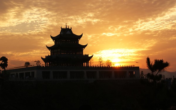 起名“問天閣”,源于2000多年前中國詩人屈原對(duì)自然界和人生求索的名作——《天問》,又因其為文博園最高建筑,問天閣這個(gè)名稱就應(yīng)運(yùn)而生了。其座西面東,坐落在烽火臺(tái)座上,占地面積約3000平方米,為三層三重檐,呈方亭式,每面57米。