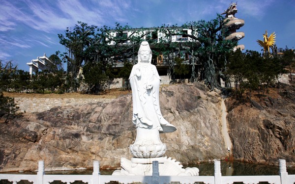 矗立于五千年文化長廊的滴水觀音塑像,其高16米,由草白玉雕刻而成。她腳踩鰲魚,衣袖流暢,手持凈瓶,凈瓶盛裝著甘露,略帶笑意,具有無量的智慧和神通,普救人間疾苦。她的慈光,如同一輪皎潔的皓月,高懸夜空,普照大地,護(hù)佑著苦難眾生;其凈瓶中的甘露永流不息,滴水聲仿佛在向游人展示把那甘露灑至世界每一角落,流進(jìn)人們的心理,凈化世人的心靈,故有‘戶戶阿彌陀,家家觀世音!’的贊語。文博園的滴水觀音大氣端莊,生動(dòng)傳神,具有濃厚的民族性,是人類珍貴的文化藝術(shù)瑰寶。