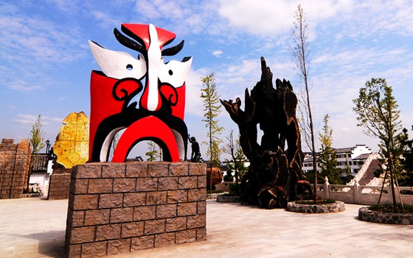 坐落于五千年文化長廊的京劇臉譜造型,其含基座高4米,寬1米6,并沒有根據(jù)某位人物造型打造,而出自于五千年文博園自己的創(chuàng)意,以紅白兩色為主色,大膽的運(yùn)用寫真、夸張、抽象的藝術(shù)形式,結(jié)合獨(dú)創(chuàng)的手工藝制作而成。其色彩鮮明、立體感強(qiáng)、線條柔美,打破了固定譜式的束縛,完全從一個(gè)全新的角度理解和認(rèn)識(shí)臉譜藝術(shù),試圖從中探求一條臉譜在現(xiàn)代生活中的現(xiàn)實(shí)意義和藝術(shù)價(jià)值。