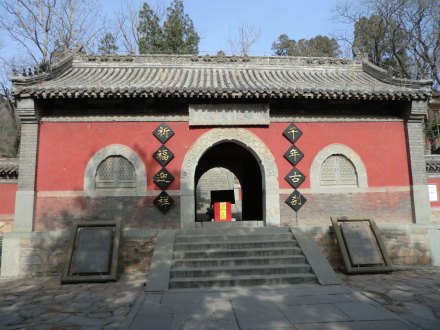 大悲寺的首層建筑是山門殿,硬山正脊灰筒瓦頂。檐下飾有丹青彩畫,殿脊正中裝飾“百鳥朝鳳”磚雕圖案。正檐下嵌有一方漢白玉寺額,上面鐫著“敕建大悲寺”五個大字,字體健勁,是康熙皇帝御筆。寺額下是漢白玉券門,自下而上對稱浮雕白象、雄獅、騰龍、翔羊;門楣正中雕飾著三尊神像,正中一尊人面鳥喙,是佛經中大鵬金翅鳥的應化形象。券門兩旁是石雕花窗,飾有蘷龍和忍冬草花紋,優(yōu)美而莊重。兩側正脊門樓造型也很精致。