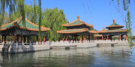東岸濠濮間、畫舫齋、蠶壇等幾組庭院式園中之園,掩映在蒼松翠柏之中,既充滿天然之趣,又有江南私家園林的神韻!北岸自東向西有靜心齋、西天梵境、澄觀堂、九龍壁、闡福寺和極樂世界,五龍亭沿湖點綴,與自然山水巧妙地融為一體,一幅不露人工痕跡、宛若天成的山水畫卷!西岸廣植花木草坪,巧妙地運(yùn)用中國造園技藝中的“障眼”手法,形成一種林中有景、花下藏幽的園林氛圍!