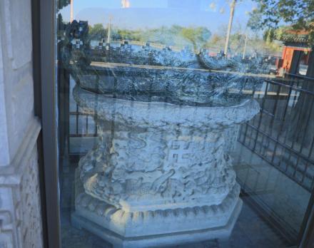 玉甕又稱“瀆山大玉海”,制作于至元二年(1265年)。口呈橢圓形,通高70公分,周長493公分,重約3500公斤,周身浮雕海龍、海馬、海豬、海犀等出沒于波濤之中,栩栩如生。元世祖忽必烈曾將玉甕放置瓊?cè)A島廣寒殿中,傳說曾用以盛酒大宴群臣。明代廣寒殿倒塌,玉甕失落民間。清乾隆十年(1745年)發(fā)現(xiàn)后,乾隆皇帝“令以千金易之,置承光殿中”,乾隆十四年(1749年)建玉甕亭,將玉甕陳設(shè)于亭中配以漢白玉雕花石座,命翰林四十人,各賦詩一首,刻于亭柱之上。