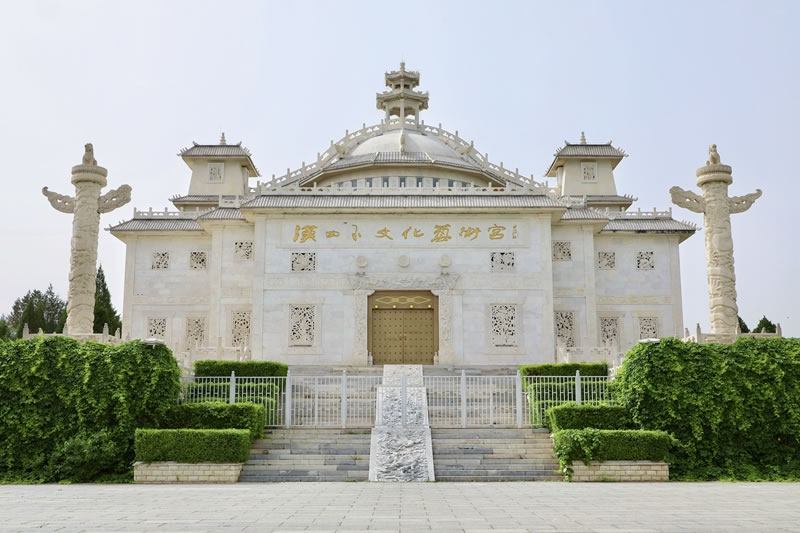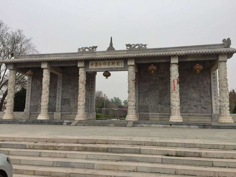中華石雕藝術(shù)園 大石窩中華石雕藝術(shù)園位于北京市房山區(qū)大石窩鎮(zhèn)。園區(qū)面積2400畝,園區(qū)內(nèi)以石為主。石神、石鼎、石橋、十二生肖各種雕塑均以大理石為原材料,精雕細(xì)作而成,充分突出了石雕的藝術(shù)特色,是北京地區(qū)最大的石雕主題公園。漢白玉藝術(shù)宮位于中華石雕藝術(shù)園內(nèi),于2002年2月份動(dòng)土施工,建筑面積2200平方米。工程的用料全部采用質(zhì)地精良的漢白玉石材,共使用漢白玉石料740多立方米。藝術(shù)宮高27米,最高端是一座棲賢亭,下面是一個(gè)半球型的漢白玉天棚,天棚的東、南、西、北、東南、西南、東北、西北方向各有一條漢白玉脊龍,天棚下端是由36根漢白玉側(cè)柱組成的圓柱型建筑,宮門的正上方是長(zhǎng)方形的漢白玉牌匾題有雕塑書法大師錢紹武提寫的“漢白玉石雕藝術(shù)宮”。藝術(shù)宮四周的漢白玉角柱、立板共280塊,其中鑲有各種圖案的漢白玉浮雕,在藝術(shù)宮的東西兩側(cè)還開(kāi)有高4.4米的九龍漢白玉卷拱門。每道門正下方均有一塊好似保和殿前“云龍階石”的御路。