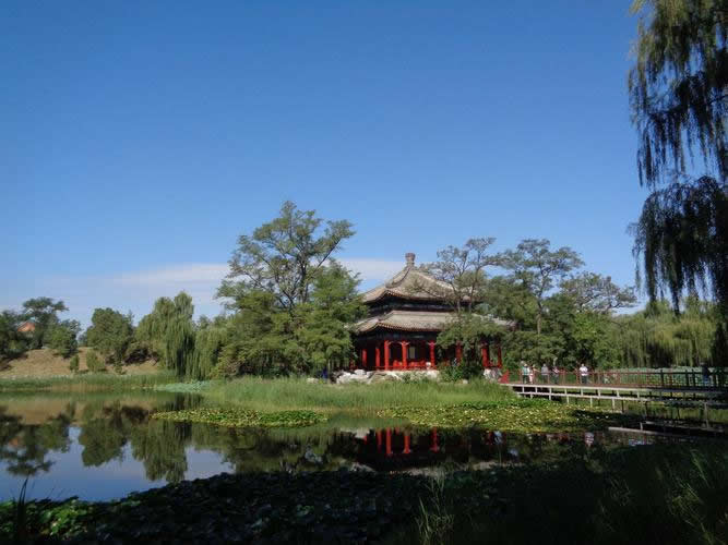 圓明三園的湖岸、池畔、溪濱,皆以垂柳為主。后湖四岸、福海周圍、南湖內(nèi)外,均遍植柳樹;北遠山村至芰荷香,水溪曲折穿萬柳;綰春軒,一樹楊柳滿院陰;雙鶴齋和深柳讀書堂,古柳籠堂合圍抱。
