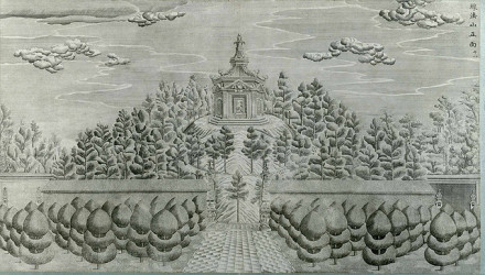 海岳開襟,是圓明園所有樓閣中最為豪華的一組建筑,海岳開襟建于圓明園中長春園的西湖內(nèi),臺基為圓形,直徑近百米,上下兩層,漢白玉石憑欄圍繞。正樓為四出軒式的三層樓閣,下層為海岳開襟,南檐題“青瑤嶼”三字;中層為得金閣,題“天心水面”四字;最上層題“乘六龍”三字;臺的四面各設牌樓一座。外側(cè)對稱布置配殿、牌坊、方亭和圓廊,是一處輝煌端莊的建筑景觀。