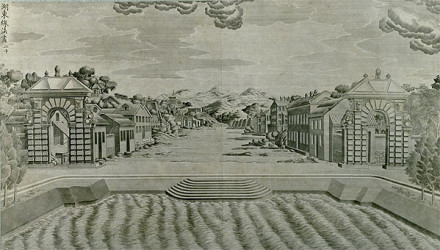 位于水木明瑟東面,是園中專門開辟的一座小城鎮(zhèn),仿照古印度橋薩羅國首都的城池布局而建,是供奉各種佛像和收藏佛經(jīng)的地方。城廓呈長方形,南北長、東西寬,四周筑有城墻,共辟4門。城內(nèi)街道呈十字形,內(nèi)建殿宇、房舍共326間,用游廊相連接;還建有數(shù)座金碧輝煌的牌樓。城前專門開設一條貫穿南北的買賣街,稱蘇州街,由宮中太監(jiān)扮作商人開市叫賣,法國教士王致誠對買賣街有比較詳盡的記載。