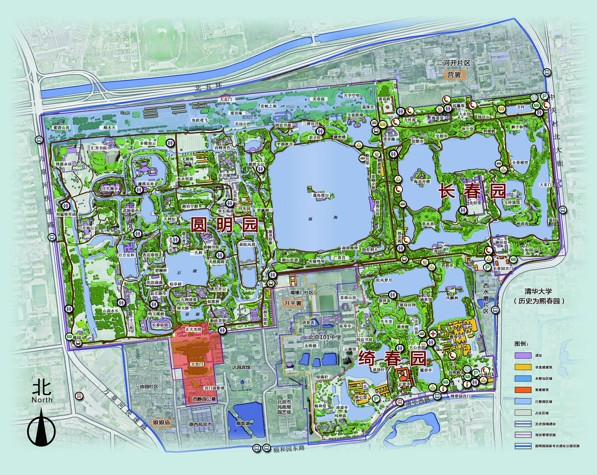 萼輝園(綺春園前身)位于暢春園的東北方向,其具體位置大致在御園北側(cè)的索戚畹園(即后來的澄懷園)以東,淑春園以北、熙春園以西,也就是綺春園(全盛規(guī)模時期)的西南部,這個區(qū)域大致為現(xiàn)一零一中學所在地。