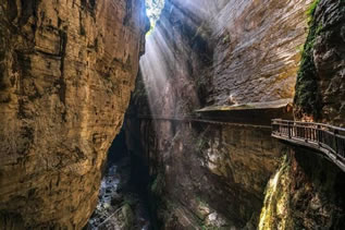 青天峽地縫全長(zhǎng)1500米,最窄處不到2米,兩岸懸崖峭壁,高度300~700米,抬頭僅見(jiàn)天光一線。地縫中怪石林立,鐘乳石千姿百態(tài),兩壁峭崖有的地方僅隔數(shù)尺。當(dāng)雨過(guò)天晴或正午陽(yáng)光朗照,陽(yáng)光穿透地縫,與崖壁上的流水發(fā)生折射后會(huì)形成“一米陽(yáng)光”奇觀。