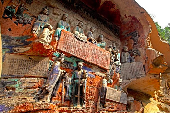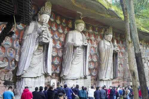 重慶市的大足石刻以其規(guī)模宏大、雕刻精美、題材多樣、內(nèi)涵豐富和保存完整而著稱于世。它集中國佛教、道教、儒家“三教”造像藝術(shù)的精華,以鮮明的民族化和生活化特色,成為中國石窟藝術(shù)中一顆璀璨的明珠。它以大量的實物形象和文字史料,從不同側(cè)面展示了九世紀末至十三世紀中葉中國石刻藝術(shù)的風格和民間宗教信仰的發(fā)展變化,對中國石刻藝術(shù)的創(chuàng)新與發(fā)展做出了重要貢獻,具有前代石窟不可替代的歷史、藝術(shù)和科學價值。許多歐洲人、尤其是法國人,對大足石刻寵愛倍加。