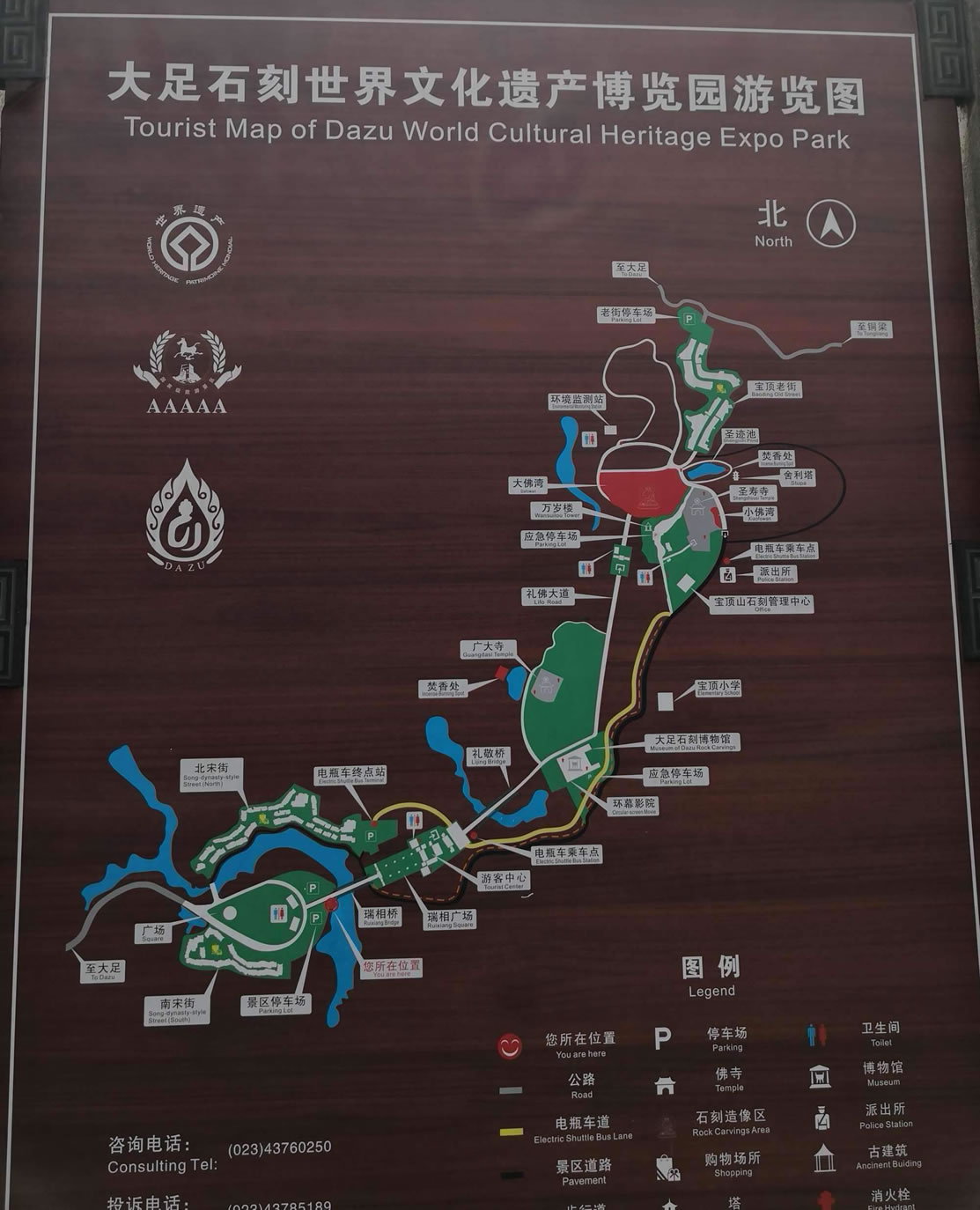 寶頂山位于大足區(qū)龍崗街道東北15千米處,海拔527.83米。寶頂山摩崖造像始鑿于南宋年間,四周2.5千米內(nèi)山巖上遍刻佛像,包括以圣壽寺為中心的大佛灣、小佛灣造像。以大足大佛灣為主體,小佛灣次之,分布在東、南、北三面。巨型雕刻360余幅,以六道輪回,廣大寶樓閣、華嚴三圣像、千手觀音像等最為著名。
