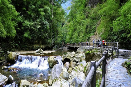 黑猴峽是黑山谷第二個(gè)峽谷,峽谷全長(zhǎng)420米,最窄處僅2米,兩岸險(xiǎn)峰重疊,犬牙交錯(cuò),岸壁傾斜超過90度,長(zhǎng)年累月難見天日,即使在烈日高照、炎熱難耐的盛夏,這里也是寒氣襲人。因有國(guó)家一級(jí)保護(hù)動(dòng)物黑葉猴經(jīng)常攀跳、嬉戲于此而得名。