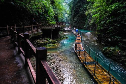 魚跳峽是黑山谷第三個(gè)峽谷,峽谷全長(zhǎng)520米,該段峽谷曲折迂回,古木參天,蒼翠欲滴,飛瀑流泉隨處可見。每年春夏季節(jié),下游的紅尾鯉、青色鯽魚、紅尾高山鯰等魚類如果要進(jìn)入上游,必須由此彈跳越過落差達(dá)1米高的魚跳灘,峽谷因此而得名。