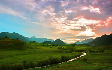 西流晚霞 紅池壩景區(qū)內(nèi)隨處都可觀賞晚霞美景,但最佳地點(diǎn)是西流溪邊海拔2076.3米的廟子包。晚霜灑滿草原,倒映溪中,天、地、人渾然一體,如詩如畫,韻味無窮。