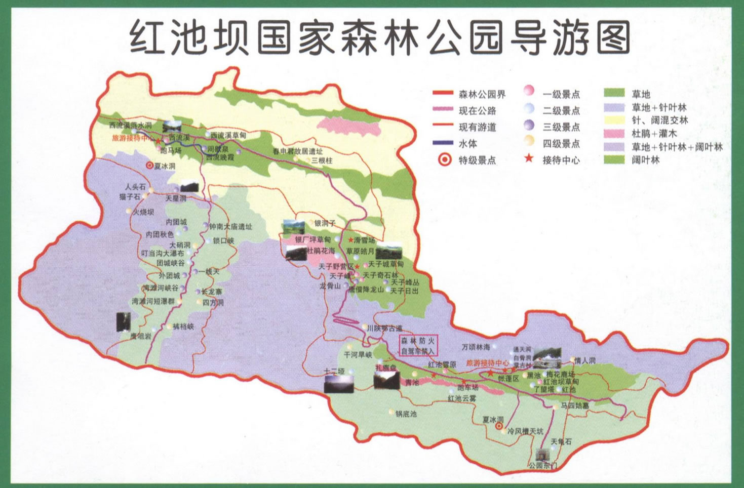 紅池壩草場(chǎng)由紅池壩、天子山、西流溪三大塊草場(chǎng)組成,面積達(dá)30余萬畝,是全國(guó)首屈一指的高山草場(chǎng)。盛夏,紅池壩茫茫草原、姹紫嫣紅、翠綠 夏冰洞欲滴,最高溫度僅為10余攝氏度,是難得的避暑勝地;秋天,天高氣爽、蜂飛蝶舞,在此可縱馬馳騁;冬天一派銀裝素裹,北國(guó)風(fēng)光,是滑冰、滑雪的理想地方。在距草場(chǎng)不遠(yuǎn)處還有聞名中外的世界奇觀——夏冰洞,每逢盛夏,洞中滴水成冰,滿目冰川、姿態(tài)萬千,而待數(shù)九隆冬,洞內(nèi)卻冰融水暖、細(xì)流涓涓,勝似溫泉,至今仍是一個(gè)謎。這里還是四條河流的發(fā)源地,“四異之水源于此”,巫溪縣原主管旅游的副縣長(zhǎng)、現(xiàn)縣人大主任傅主任如是向記者介紹道,南到云陽的湯溪河、大寧河的源頭——西溪河、大寧河主要支流——后溪河、仁河這四條流向不同的河流均發(fā)源于此。