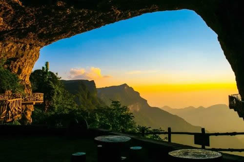 古佛洞位于山頂部位藥池壩東北側(cè),海拔2100米。進洞口高約5米,寬3米,經(jīng)洞左狹窄通道進入有1公頃大的“大廳”,內(nèi)有古佛、石棺材、米市、戲樓等景點。左行400余米,洞穴逐漸收縮,形成人工隧道似的大通道,斜上出洞,出口在金佛山正北絕壁上,洞高約20多米,寬約40米,呈月牙形,極目遠眺,北坡峰巒盡在腳下,南川城區(qū)歷歷在目。經(jīng)探測,洞分上、下兩層,上層長1072米,面積46公頃,另有支洞8條,網(wǎng)狀分布,總長1112米;下層狹窄曲折,另有朝南的狹小出口。