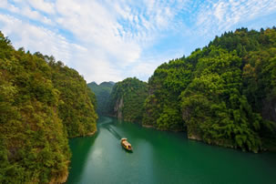 神龜峽位于阿蓬江下游,是國家4A級旅游景區(qū),因峽口兩山酷似雌雄雙龜對臥而得名。兩岸高山絕壁,河道斗折蛇行,形成了天門、巨佛、三郎峰、石壁畫廊、薄刀嶺等奇特景觀,盡顯自然的鬼斧神工。沿途絕壁夾江,全程有27個彎,有神門、天門、人門等28個門,其彎道之多,實屬峽谷罕見。峽谷兩岸茂林修竹,植被原始古樸,生態(tài)優(yōu)美。兩岸不時有飛瀑奔瀉而下,情趣飄逸。富顯詩情畫意,是舞文的書齋,揮毫的畫卷,科考的著床。