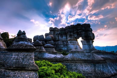 萬盛石林景區(qū),不僅怪石林立,且地下溶洞景觀遍布。主要為水平溶洞和垂直溶洞兩種。水平溶洞有天門洞、過街樓溶洞、涼風(fēng)洞、仙女洞、關(guān)馬洞、偷牛洞、九龍洞、觀音洞等。其中,數(shù)天門洞景觀獨(dú)特,造型別致,洞內(nèi)石筍、石柱、石花、石幔,吊、立、鉗,各盡其志,如玉器晶瑩,如宮殿輝煌?芍^“天造地設(shè),鬼斧神工”。
