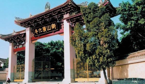 南山廣化寺:座落在城南鳳凰山,F(xiàn)行建筑群是清光緒初年依舊制重修的,從20世紀(jì)80年代開始,進(jìn)行了大規(guī)模的擴(kuò)建。山門照壁上有中國(guó)佛教會(huì)已故會(huì)長(zhǎng)趙樸初題寫的“莊嚴(yán)國(guó)土,利樂有情”。廣化寺占地3.2萬多平方米,建筑物面積1.7萬平方米。踏入山門,沿著中軸線建筑拾級(jí)而上,全長(zhǎng)385米。依次是照壁、牌坊、山門、放生池、彌勒殿(天王殿)、大雄寶殿、法堂(上為藏經(jīng)閣)、臥佛殿(下為祖堂);兩側(cè)翼建有寬敞的石柱廊廡,東側(cè)次第為東羅漢殿、鐘樓、五觀堂、伽藍(lán)殿、尊客堂、水云鄉(xiāng)、圓通門、溪聲閣;西側(cè)次第為西羅漢殿、鼓樓、學(xué)戒堂、祖師殿、凈行堂(念佛堂)、煙霞窟、方丈室、看山樓。寺后東西兩角的最高處,分別聳立著觀音閣和小南山。南山上有幾十株不知年代的蒼松翠柏。