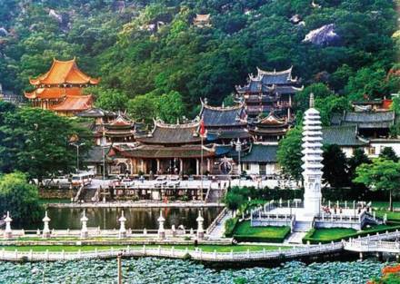 南普陀寺,位于廈門市思明區(qū),始建于唐末五代,初稱泗洲院。北宋僧文翠改建稱無(wú)盡巖。元廢。明初復(fù)建,更名普照寺。明末詩(shī)僧覺(jué)光和尚遷建于山前,殿堂院舍齊備,住僧常達(dá)百余眾,清初又廢于兵禍。清康熙二十二年(1684年),靖海候施瑯收復(fù)臺(tái)灣后駐鎮(zhèn)廈門,捐資修復(fù)寺院舊觀,又增建大悲閣奉觀音菩薩,并以之與浙江普陀山觀音道場(chǎng)相類比,更名為南普陀寺,此后數(shù)百年來(lái),經(jīng)歷代主持景峰、省己、喜參諸和尚多次重修擴(kuò)建,至民國(guó)初年,已構(gòu)成三殿七堂俱全的禪寺格局。