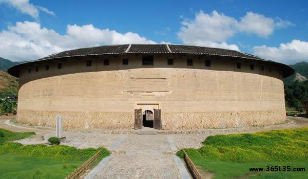 二宜樓:這座被譽(yù)為"國(guó)之瑰寶"的圓土樓,座落在華安縣仙都鎮(zhèn)大地村。仙都、大地,這是多么富有詩(shī)意的名字,其實(shí)二宜樓就是人間天堂的一座民居,就是中華大地的一顆璀璨明珠。 二宜樓依山傍水,樓后峰巒疊嶂,近處山丘綿延,猶如蜈蚣緩緩爬行(風(fēng)水先生稱之為"蜈蚣吐珠地");兩條清澈的小溪在樓前交匯后,直奔西南而去。青山綠水,與黃墻黑瓦交相輝映,小橋、樓閣、翠竹、村舍點(diǎn)綴其間,渾然一體,正是"宜山宜水"的一派旖旎風(fēng)光。樓內(nèi)祖廳便有一對(duì)柱楹,專門概述這一景觀:"倚杯石而為屏,四峰拱峙集邃閣;對(duì)龜山以作案,二水瀠洄萃高樓。" 所謂宜山宜水,其實(shí)還隱寓樓主蔣仕熊排行第二,又是第二次擇地,才選中這蜈蚣吐珠穴位,其得意之情溢于言表。在族人的傳說里,蔣仕熊年輕時(shí)是個(gè)種田能手,他身材高大,體格健壯,臂力超人,能使一把廿四斤重的大刀,可惜他人才超群,卻遲遲未能成家,說是犯了"孤鸞命",注定一輩子打光棍。族人背地里取笑他說:"無(wú)某(妻)無(wú)猴,鎖匙掛褲頭。"他一氣之下出走他鄉(xiāng),到安溪、漳平等地開墾荒田幾百畝。不久,他遇到了一個(gè)魏氏姑娘,兩人婚配后,生了六個(gè)兒子。蔣仕熊晚年衣錦返鄉(xiāng),開始投巨資建樓,由于操勞過度,他在二宜樓尚未建成時(shí)便不幸逝世,他的六個(gè)兒子、十七個(gè)孫子繼承遺志,艱苦努力,終于在清乾隆35年(1770年)把大樓建成。