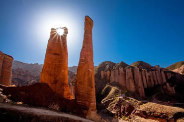 這是冰溝丹霞景區(qū)的又一標志性景觀。兩個并排而立的石柱,高約50米,它是由紫紅色砂巖、礫巖、夾砂礫巖構成,在流水沖蝕及凍融風化剝蝕等外動力作用下,沿著垂直節(jié)理崩塌、解體,使巖墻分割,形成兩個孤立的直徑不同的石柱,均上細下粗、上圓下方,說明風化作用是自上而下進行的.石柱下方還基本保留原始節(jié)理切割地層后留下的棱角,形狀像一對逼真的男女生殖器官。左側的石柱為男柱,頂端如蘑菇;右側的石柱為女柱。