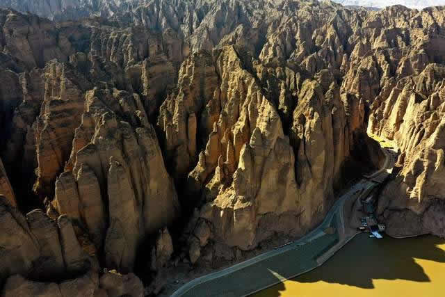 自觀景臺(tái)迂曲而下,轉(zhuǎn)過二十二道彎,再穿過一片棗林和莊稼地,抵達(dá)黃河。立足河邊,轉(zhuǎn)身仰目,峰林聳立,座座相連,氣勢磅礴,頗具天然大園林神韻。沿黃河左行、右行,或過河前行,均可游覽石林。景區(qū)內(nèi)峽谷蜿蜒曲折,皆以溝命名:七口溝、盤龍溝、喜望溝等,另外還有千米洞、盤龍洞等幾十處洞穴。