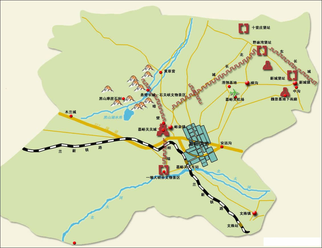 長(zhǎng)城第一墩、懸壁長(zhǎng)城、黑山淺石刻巖畫(huà)、長(zhǎng)城博物館、魏晉墓地下畫(huà)廊、七一冰川),為旅游業(yè)的發(fā)展奠定了資源基礎(chǔ)。