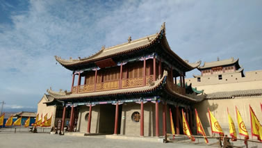 建于明正德元年(1506年),由時任肅州兵備副憲李端澄主持修建!肮饣瘶恰睘槿龑尤苄巾斒浇Y構,樓高17米。精雕細刻,五彩裝成。樓閣第一層為磚木結構,第二、三層是木結構榫卯咬合而成,雖經(jīng)歷了近五百年的風風雨雨及地震等自然災害,仍巍然屹立于關城之上。