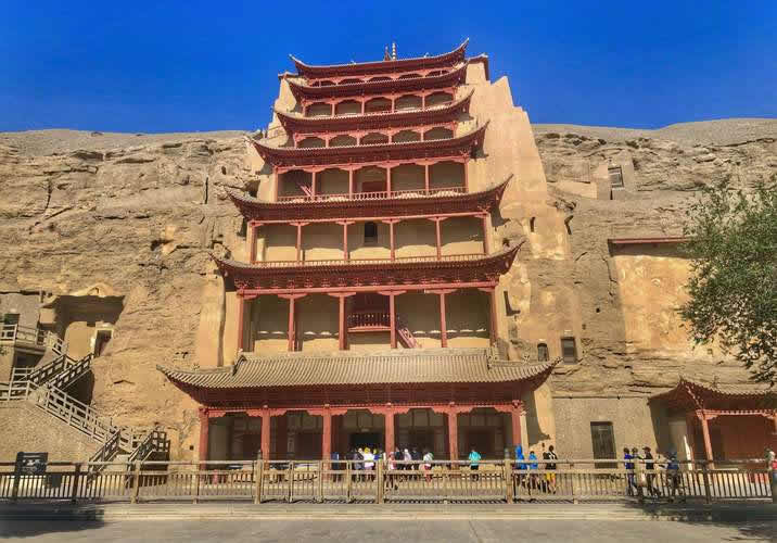 第96窟窟外木構(gòu)建筑之俗稱。唐代稱北大像。俗稱大佛殿。代表窟之一。敦煌石窟之第一大窟,建于初唐。洞窟直通崖頂,高40米,窟外有九層木構(gòu)建筑,高45米。窟內(nèi)徒壁無畫,依崖塑敦煌石窟中最大塑像(高33米)的彌勒佛像。高度僅次于四川樂山石刻大佛(71米)和四川榮縣石刻大佛(36米余)。在泥塑造像中,其高度則為全國之冠。