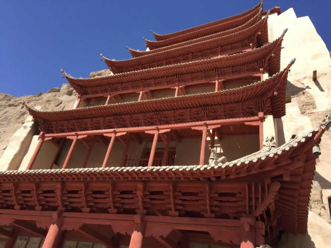閣樓依崖就窟而起,下八層為五間六柱大型兩角窟檐,檐角上翹,有線脊,下垂風(fēng)鐸(俗稱鐵馬)。第一層正對本窟巨型窟門,第四層和第七層各對洞窟明窗。第九層為八角頂,上豎3米高寶瓶,窟、像即以此頂相覆,三者共融一體。據(jù)P.2762《張淮深勛德記》及《宋乾德四年重修北大像記》、1936年《重修千佛洞九層樓碑記》(此碑已毀,僅存錄文)記載,武周初建大佛時(shí),樓為四層。晚唐乾符年間(874—879),沙州歸義軍節(jié)度使張淮深重建,改四層為五層。宋乾德四年(966)沙州歸義軍節(jié)度使、托西大王曹元忠及其妻涼國夫人潯陽翟氏避暑莫高窟,將下兩層糟朽梁、柱拆換重建(上三層仍保存原建筑)。清光緒三十四年(1908),敦煌商民戴奉鈺集資重修,改五層為七層。1928年,劉驥德等合莫高窟住持喇嘛易昌恕等重建,改七層為九層,于1935年建成,即今之“九層樓”。