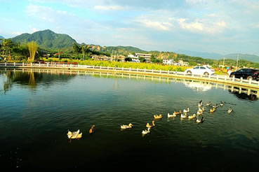 臺(tái)灣度假村位于長(zhǎng)潭旅游區(qū)入口處的虎形山,占地面積218畝,主要開(kāi)發(fā)廣場(chǎng)、朝圣區(qū)、游樂(lè)園、賓館、別墅、展覽館、科技城、美食一條街、農(nóng)業(yè)觀光和苗圃等項(xiàng)目。為一富娛樂(lè)性、知識(shí)性、觀賞性之休閑場(chǎng)所。1998年11月動(dòng)工,1999年,度假村建成戲水樂(lè)園、滑草坪、親子園地、世界蝴蝶館,此館擁有全國(guó)最多的蝴蝶種類(lèi),為廣東省最大最具規(guī)模的觀賞樂(lè)園。此外還成功引種臺(tái)灣名優(yōu)稀特水果火龍果。臺(tái)灣度假村風(fēng)光旖旎,富有詩(shī)情畫(huà)意,依山構(gòu)筑的山門(mén)別具一格,其景觀廣場(chǎng)、游樂(lè)園、朝圣區(qū)、科技城錯(cuò)落在山水、綠樹(shù)之間,水色塋潔,光可照人。