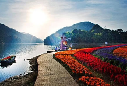 “夏日花!笔鞘铒L(fēng)光區(qū)的天池花海景點(diǎn)的夏日特色花海,位于海拔800多米的石灶天池之畔,面積近百畝。“夏日花!庇苫鸺t燦爛的一串紅、花中之禽雞冠花、英雄之花紅穗冠、香草之后薰衣草組成,與原始次生林、水生植物園和天池編織出一幅如童話世界般的美麗畫卷。特別是單一紫色花朵代表真愛的薰衣草,總是能讓人聯(lián)想到溫馨的浪漫。