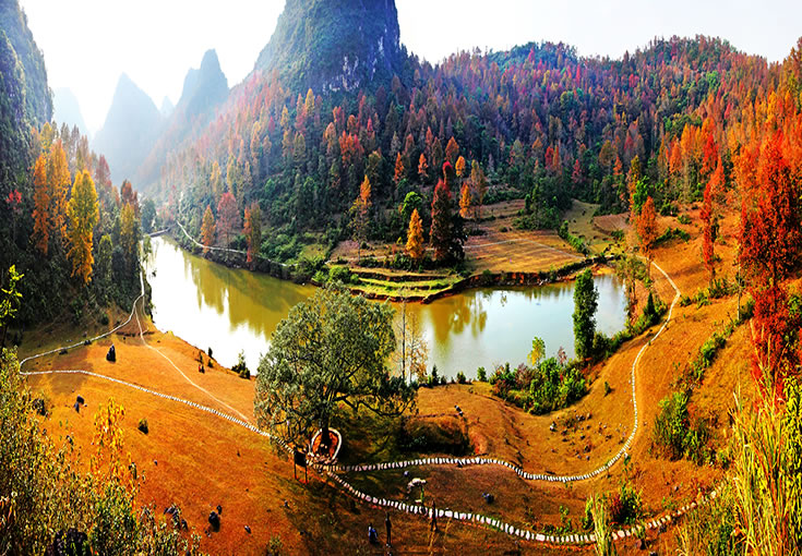 紅葉森林公園位于德保縣東北側(cè)方向,國(guó)家AAAA級(jí)旅游景區(qū)暨自治區(qū)級(jí)森林公園,距縣城3.5公里,交通便利。公園規(guī)劃面積1036.5公頃,該公園核心景區(qū)為紅楓湖游覽區(qū)和紅葉谷游覽區(qū),以紅楓為主題。金秋時(shí)節(jié),楓葉似火,湖水輕柔,互襯互耀,頗具詩(shī)情畫(huà)意。公園的紅葉品種主要以楓香為主,葉子顏色分別有深紅、絳紅、霞紅、黃紅混合等,觀賞時(shí)間較長(zhǎng),有著“德保楓葉賽九寨”的美譽(yù),是秋季里一道亮麗的風(fēng)景線。公園以紅楓湖、紅葉谷一帶的紅楓林為依托,襯托著多姿多彩的紅葉森林景觀、森林生態(tài)景觀、底蘊(yùn)深厚的人文景觀和綺麗迷人的水文景觀,將紅楓湖、上章湖、紅葉谷構(gòu)成休閑避暑游覽的大旅游圈,景區(qū)內(nèi)上章水庫(kù)和百布水庫(kù)交相輝映,總庫(kù)容量分別為365萬(wàn)立方米和190萬(wàn)立方米;有效灌溉面積分別為2200畝和2000畝。目前,景區(qū)各項(xiàng)基礎(chǔ)設(shè)施正在逐步完善。德保境內(nèi)有10萬(wàn)多畝連片的紅楓林,遍布城關(guān)、那甲、馬隘、巴頭等鄉(xiāng)鎮(zhèn)。除紅葉森林公園外,馬隘至巴頭一線還有許多別具特色的賞楓景點(diǎn),無(wú)一不令人流連忘返。