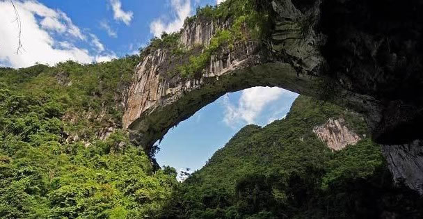 布柳河仙人橋景區(qū),地處樂業(yè)縣新化鎮(zhèn)磨里村布柳河大峽谷,距縣城51公里,該峽谷全長16.9公里。沿河兩岸綠樹成蔭,有“植物的王國,鳥類的天堂”之美稱,河里魚兒穿梭,既可漂流,又可觀光旅游。布柳河上還有一座由三座大山塌陷形成的天然石拱橋,坐落于漂流河段下游,當(dāng)?shù)厝朔Q為“仙人橋”。仙人橋拱孔跨度177.14米,橋?qū)?9.3米,橋身長280米,橋身厚78米,總橋高165米,拱高87米。