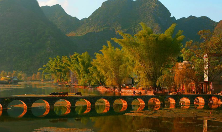 鵝泉,與云南大理蝴蝶泉、廣西桂平西山乳泉并稱為中國西南三大名泉。是世界第二大跨國瀑布德天瀑布的源頭,位于廣西靖西市區(qū)南約5千米的小鵝山麓。因鵝山像一只鵝躺在泉水之上,故名。為國家AAAA級(jí)旅游景區(qū)。 古橋,建于清朝年間,橋長約60米,寬1.5米,全為石灰料石組成,是由15個(gè)涵洞的石拱橋組成,鵝泉古橋?yàn)榫肝魇斜A舻帽容^完整的古橋。