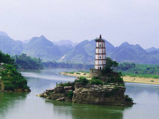 左江斜塔又名歸龍塔、水寶塔、歪塔,古稱鎮(zhèn)海寶塔,是世界八大斜塔之一,位于崇左縣城東北二千米處左江中的鱉頭山上。該塔建于明朝天啟元年(公元1621年),始建三層。清康熙三十五年(公元1696年)續(xù)建二層,為五層磚塔。塔底直徑5米,塔高18.28米,塔身呈八面體,塔頂置圓形鐵鍋一口。東西面砌磚數(shù)相差兩塊,故整座塔呈傾斜狀態(tài)。傾斜方向為西南偏西52°16′30″,傾斜度為4°24′64″,斜向與江水的流向正好相逆。