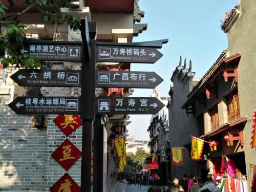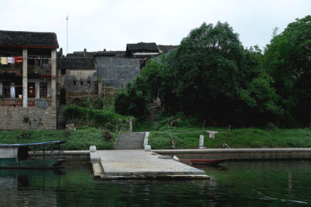 碼頭多用料石鑲砌,亦有因礁而設(shè)者。它們長10余米,寬約3米,皆伸入江底,浮出水面,呈長方形平臺狀。比起桂北一般圩鎮(zhèn)的碼頭來,它們顯得穩(wěn)重,大氣;若與武漢的江岸碼頭,北海的深水碼頭相比,則顯得小巧玲瓏,古樸秀美。它們順江排列,而兩者之間卻并不等距,具有一種錯落感,富有美學價值。碼頭靠岸的一端,多連有一段平地,或古榕濃蔭,或龍亭飛角,或丹桂飄香,或鳳竹搖曳,兼有實用和觀賞價值。碼頭與鎮(zhèn)區(qū)均有巷道相通,依坡砌級,石板鋪路,高墻夾擁,逼深邃,天光一線,給碼頭平添一種縱深感和活力。
