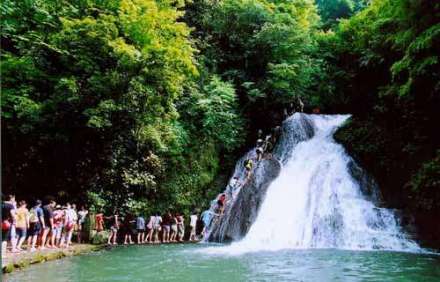 瀑布源頭比漓江水面高出180米,是我國唯一一個由地下涌泉形成的多級串連瀑布;是一個因鈣華沉積作用可逐漸長高而改變景致的瀑布。八級瀑布形態(tài)各異,有的如鴛鴦戲水,有的如蛟龍噴水,有的懸于長滿青苔的巖壁上,瀑水如布,水紋清晰可鑒,呈白色透明狀,猶如噴霧行云;有的水流集中下注跌入深潭濺起層層水霧浪花,猶如細雨蒙蒙,瀑布兩岸林木蔥郁,蔭蔽幽靜,水質(zhì)清洌,涼爽甘甜。山腳亞熱帶雨林濃郁,藤蔓垂壁,叢林險徑,三千多畝的楓樹和馬尾松,風吹林動,鳥語花香,令人有回歸自然的親切感。到了深秋時節(jié)的紅楓更是別一番“霜林盡染,漫山紅遍,紅葉鋪滿山徑”的美景。