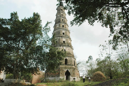 貴港市城東五里的羅泊灣,形如蘿卜,因而原名蘿卜灣。灣上有一座巍峨古塔,名曰安瀾,又曰漪瀾,塔高九層約30多米,底層周長(zhǎng)36.62米,墻厚1.9米,塔身呈八角形,共有35個(gè)形狀不同的窗口,坐南向北臨江而立,建筑風(fēng)格非常獨(dú)特。此塔建于清嘉慶二十三年(1818),已經(jīng)有200多年。昔日登塔可望江城,江中百舸爭(zhēng)流,浪擊飛舟,城上高樓林立,車水馬龍,人來人往,無限風(fēng)光在塔峰。此塔遭受過無數(shù)次特大洪水的沖撞和雷電轟擊,仍巋然不動(dòng),穩(wěn)如泰山,塔頂?shù)耐咂坏袈,塔身沒有毀損,保留全貌。