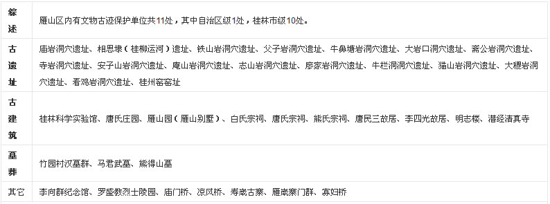 雁山區(qū)境內(nèi)風(fēng)景名勝有漓江、相思江、冠巖、父子巖等山水自然風(fēng)貌;有雁山公園、唐氏莊園、相思埭遺址、廟巖洞穴遺址、桂州窯窯址、竹園漢墓群、馬君武墓、羅盛教烈士陵園等自治區(qū)、市文物保護(hù)單位;有壽崴古寨、雁咸古寨門、潛經(jīng)白氏宗祠、潛經(jīng)清真寺、竹園廟門橋等古寨古建筑;有冠巖景區(qū)、愚自樂(lè)園、雁山植物園、神龍谷、蛇王李莊園、龍門古榕等生態(tài)園林人文融合景觀。其中漓江雁山段是桂林漓江景區(qū)5A級(jí)景區(qū)的一部分;桂林冠巖景區(qū)、愚自樂(lè)園是4A級(jí)景區(qū);神龍水世界景區(qū)、多耶古寨——蛇王李景區(qū)是3A級(jí)景區(qū)。