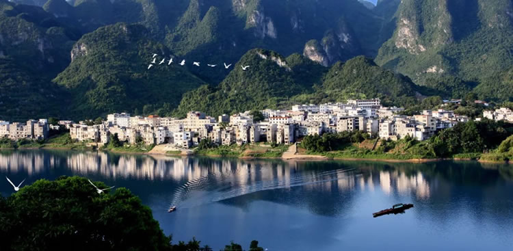 “紅水河第一灣”是國家AAAA級(jí)景區(qū),位于三石鎮(zhèn)板文村。紅水河在流經(jīng)東蘭縣板文村境內(nèi)拐了一個(gè)大彎,形成一個(gè)“U”字型的大峽谷,山環(huán)水繞,碧如玉環(huán),中間主峰如神龜靜臥,兩岸峰叢對(duì)稱排開,谷底河灘幾十個(gè)水譚或?qū)ΨQ、或連通,奇妙非常。山間林木翠綠蔥蘢,獼猴跳躍,百鳥爭鳴。在山頂上銅鼓觀景玻璃臺(tái)觀賞第一灣奇景,若在晨起碰到云霧天氣,霞光普照,霧繞神灣,幻若仙境。有詩描述:“一灣驚天下,回首造高峽,千山還壯美,奔流再出發(fā)!”該景區(qū)是紅水河的精華河段,是攝影、探險(xiǎn)、休閑度假的好地方。
