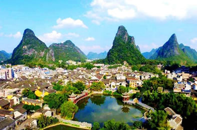 黃姚古鎮(zhèn)有“詩境家園”的“小桂林”之稱。境內(nèi)奇峰林立,古木參天,溶洞幽深,清溪環(huán)繞。古鎮(zhèn)有“六多”:山水巖洞多、亭臺樓閣多、寺觀廟祠多、祠堂多、古樹多、楹聯(lián)匾額多。古鎮(zhèn)內(nèi)有山必有水,有水必有橋,有橋必有亭,有亭必有聯(lián),有聯(lián)必有匾,構(gòu)成了古鎮(zhèn)獨特的風(fēng)景。古鎮(zhèn)8條主街道全部用黑色石板鑲嵌而成,雖歷經(jīng)滄桑,仍無絲毫松動,街道平滑如鏡。鎮(zhèn)內(nèi)600多座古建筑為九宮八卦陣式布局,屬嶺南風(fēng)格建筑。