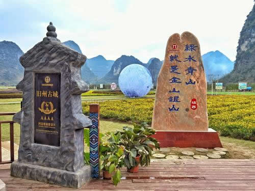 舊州景區(qū)位于廣西壯族自治區(qū)靖西市市區(qū)以南8公里,四面被喀斯特地貌群山層層環(huán)抱,古城在兩條河流的匯集處依水而建,年平均氣溫19.9℃,四季宜人。“山水賽桂林,氣候似昆明”,人文古跡眾多,壯族風(fēng)情濃郁,素有“壯族活的博物館”之美譽(yù)。2018年成功評(píng)定為國家AAAA級(jí)景區(qū)。