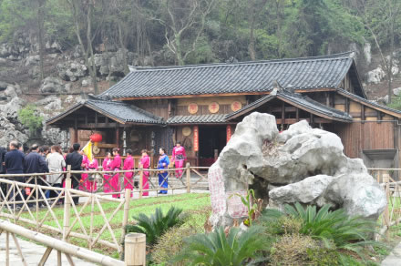 “如今廣西成歌海,都是三姐親口傳”。劉三姐是傳說中的壯族歌仙,她以山歌為武器,與土豪莫懷仁進(jìn)行了針鋒相對(duì)的斗爭(zhēng)。景區(qū)內(nèi)的豪宅就是莫懷仁居住的莫府。莫府坐北朝南,東青龍,左傍蒼翠秀美的西山;西白虎,右依靈氣生生的踩月山;南朱雀,前環(huán)美麗的桃花江;北玄武,背靠徐霞客記載過的獅子峰。